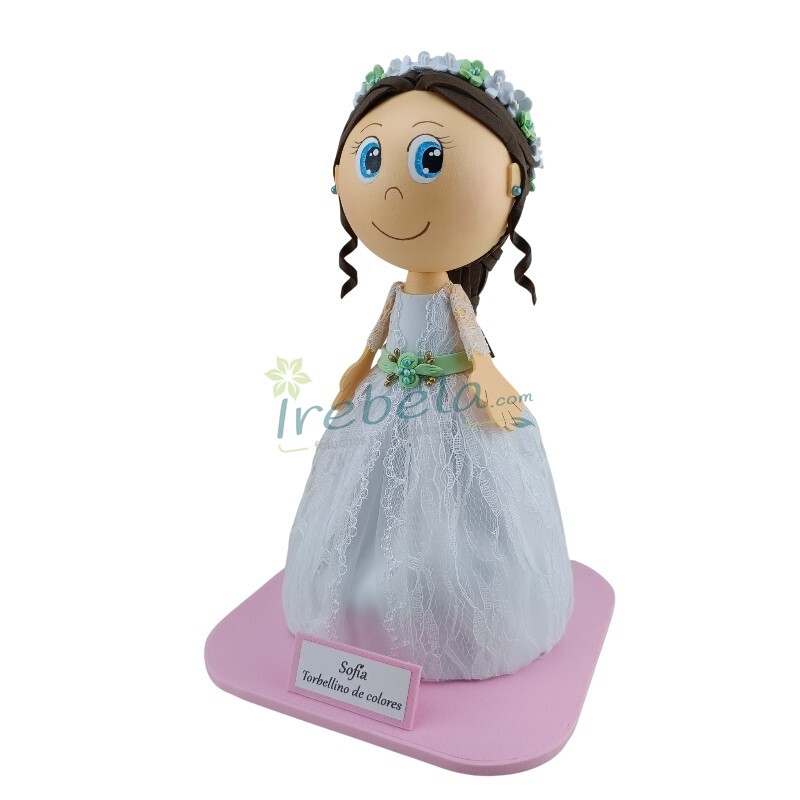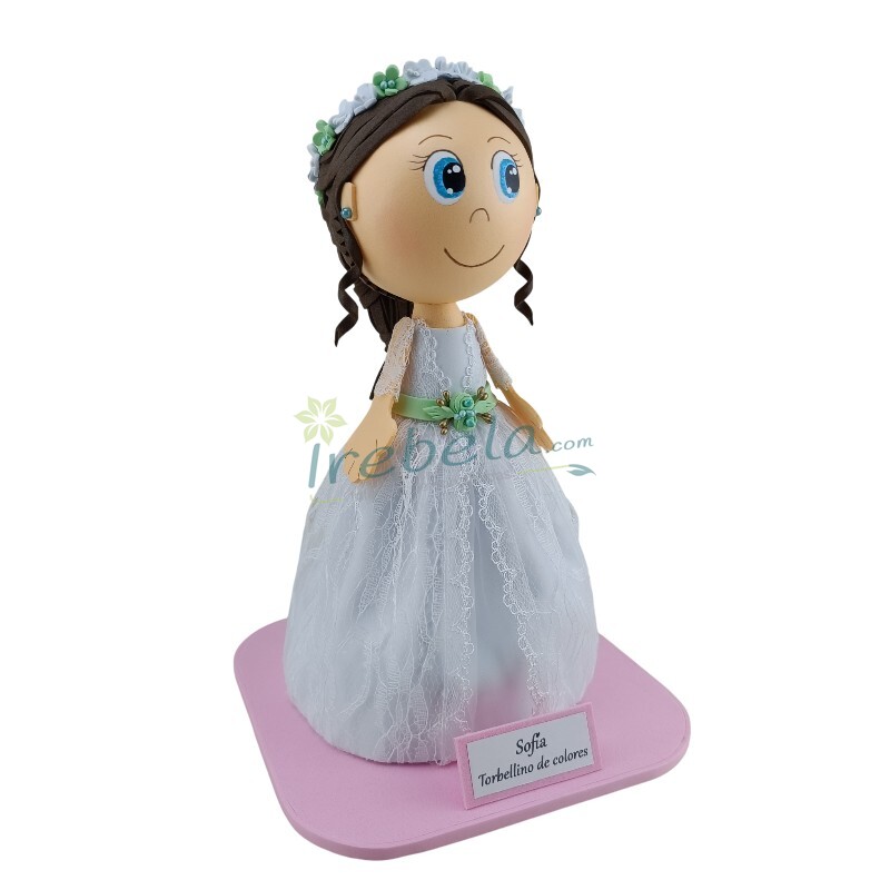 Original muñeca fofucha personalizada, representando una profesora, elaborada con bolas de porex y gomaeva de diferentes colores, así como algunos complementos en tela. Podrían realizarse variaciones en la vestimenta, color de pelo, color de ojos, peinado... (siempre bajo petición del cliente con antelación). La muñeca se ha colocado en el escen...