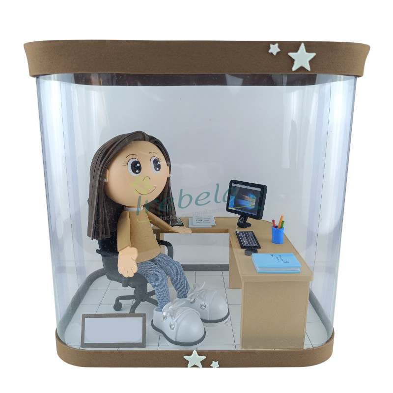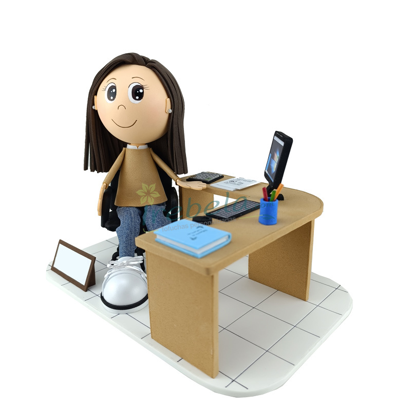Original muñeca fofucha personalizada, representando una profesora, elaborada con bolas de porex y gomaeva de diferentes colores, así como algunos complementos en tela. Podrían realizarse variaciones en la vestimenta, color de pelo, color de ojos, peinado... (siempre bajo petición del cliente con antelación). La muñeca se ha colocado en el escen...