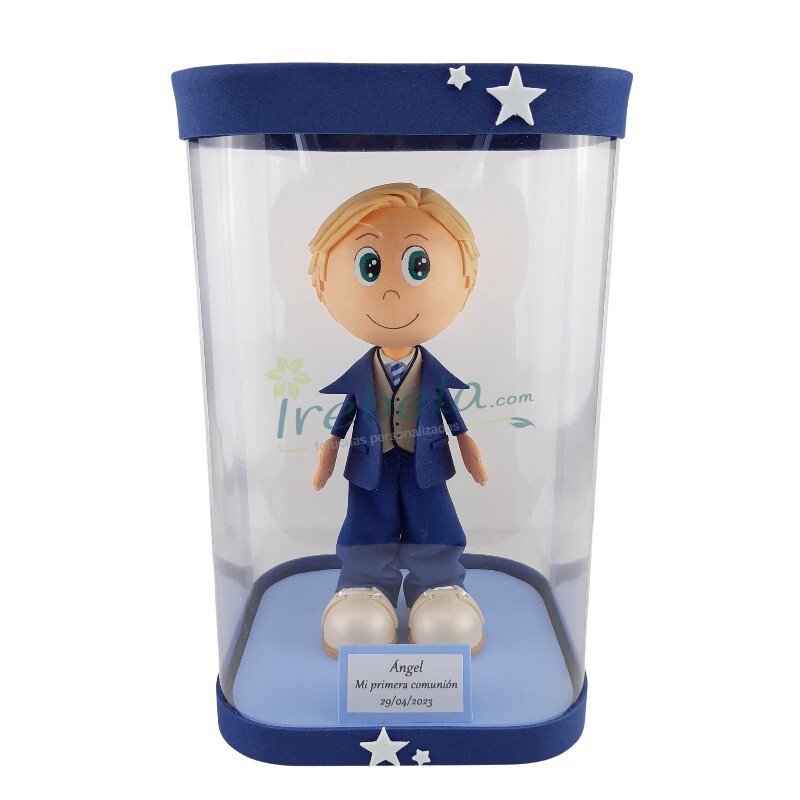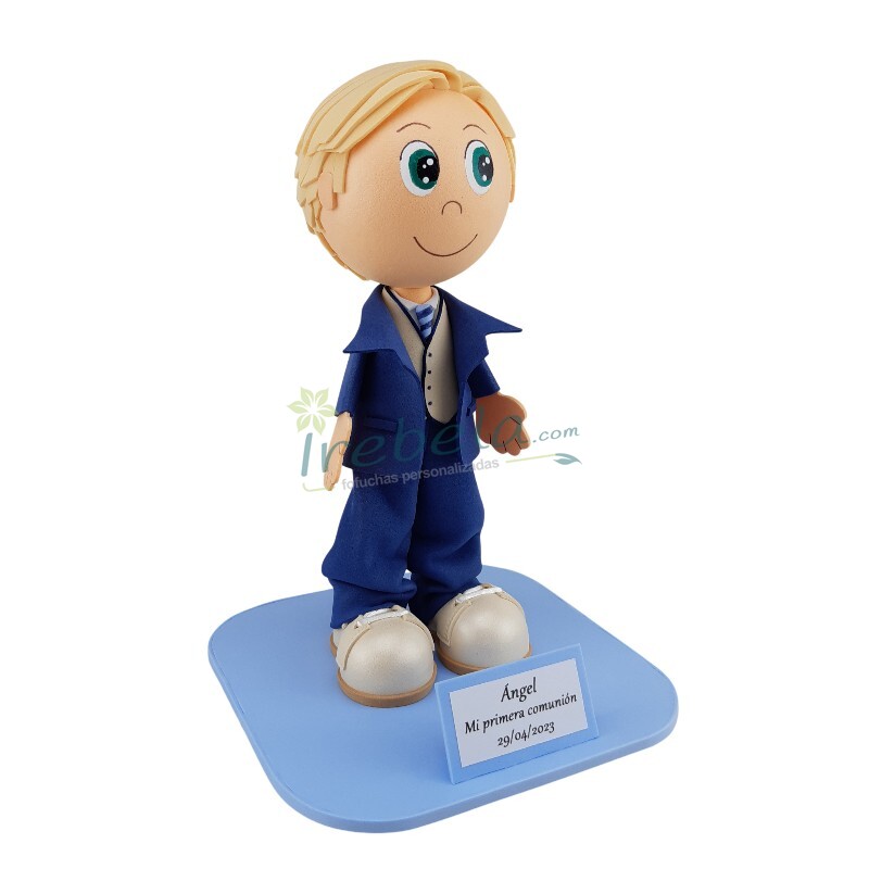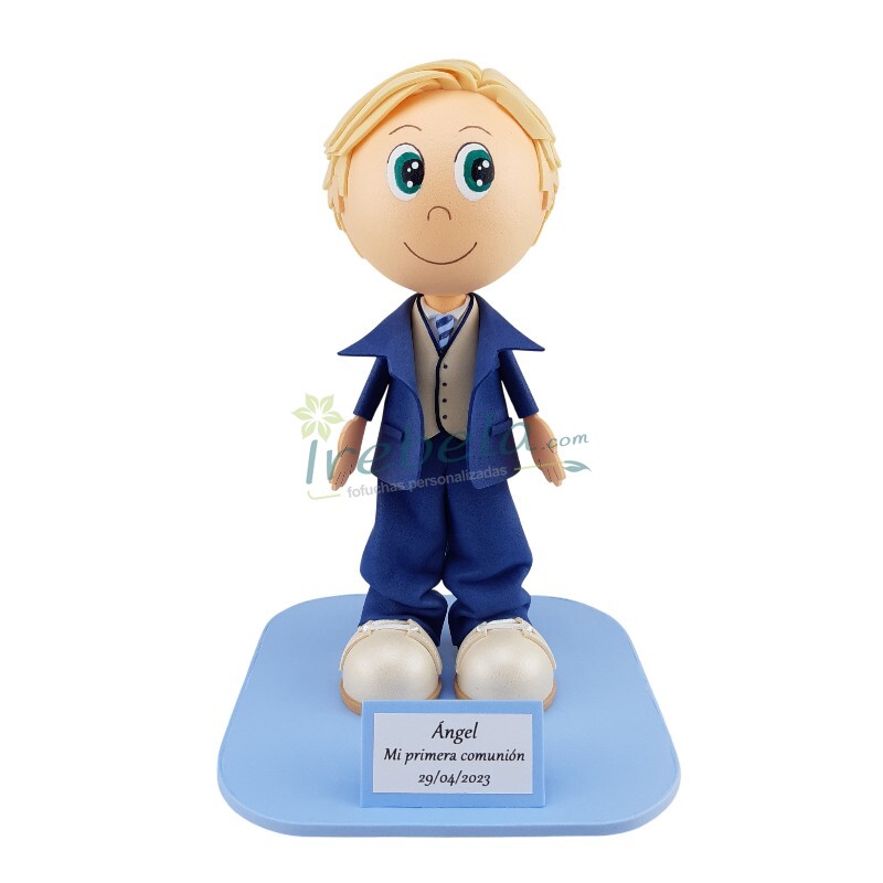 Fofucho de comunión niño con traje azul marino, chaleco color crema y corbata